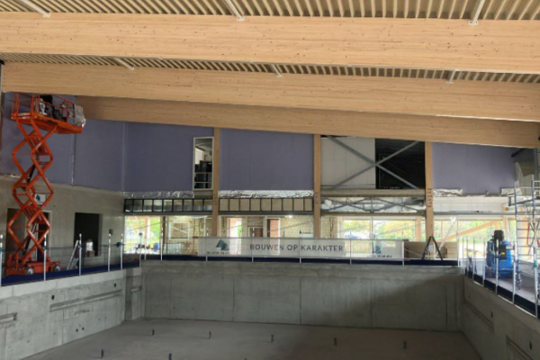 Intussen verloopt ook de bouw voorspoedig. Alle kozijnen zijn geplaatst, zowel in de buitengevel als tussen de horeca en het zwembad en de overige ruimtes. Het dak is inmiddels volledig bedekt met zonnepanelen en de eerste inbouwreservoirs hangen al op hun plek.