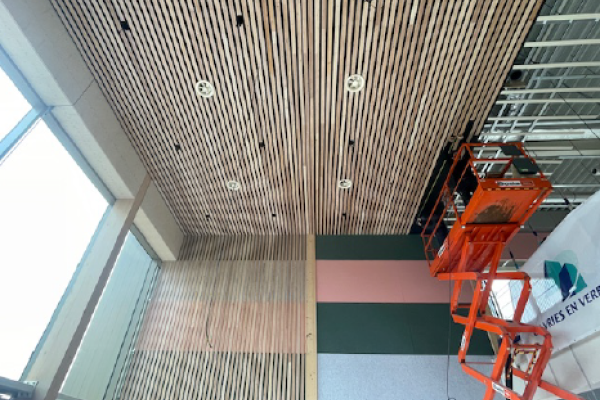 Binnen wordt zichtbaar hard doorgewerkt. Het tegelwerk in de douches, de keuken en de badmeesterpost schiet mooi op. Ook de betimmering van het plafond en de wanden in de entreehal is nagenoeg afgerond. Voor deze afwerking zijn latten hergebruikt uit de oude De Schelft. De aannemer heeft deze zorgvuldig opgeschuurd, waardoor ze er weer als nieuw uitzien.